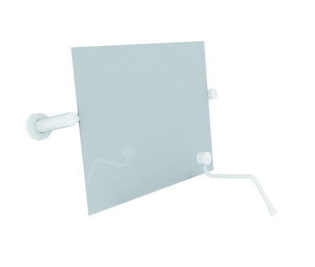 550 x 500 mm, mit seitlichen Haltestützen aus Nylon, Ø 34 mm, erhältlich in den Normbaufarben, Kristallspiegel 500 x 500 mm mit geschliffenen Kanten und abgerundeten Ecken, Neigung bis 25 Grad nach unten und oben stufenlos einstellbar, Einstellung der Verstellkraft möglich, Bedienhebel mit ergonomisch geformtem Griffende, seitlich schwenkbar, links und rechts montierbar, geeignet für Vorwandmontage bis 150mm, mit Rosetten Ø 70 mm für verdeckte Verschraubung, Rosettenunterteile und Schrauben aus Edelstahl. Lieferung mit Edelstahl Torx-Schrauben Ø 6 x 70 mm und Dübel für Vollbaustoffe.